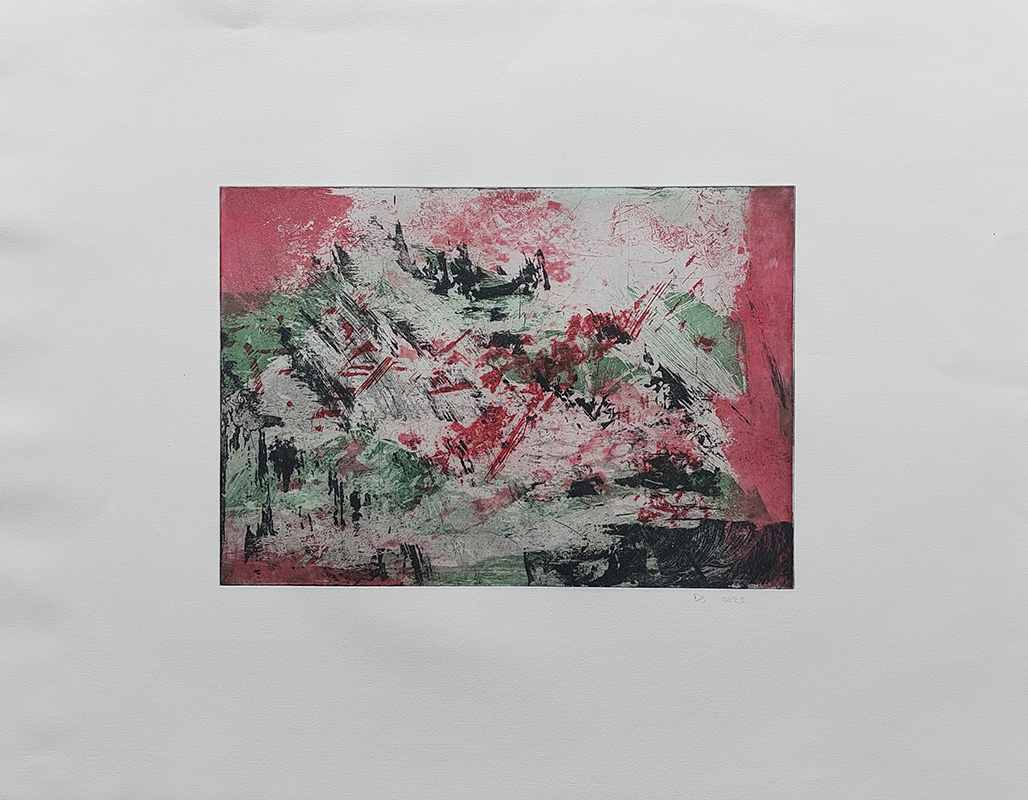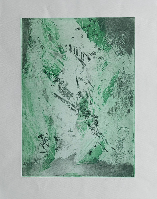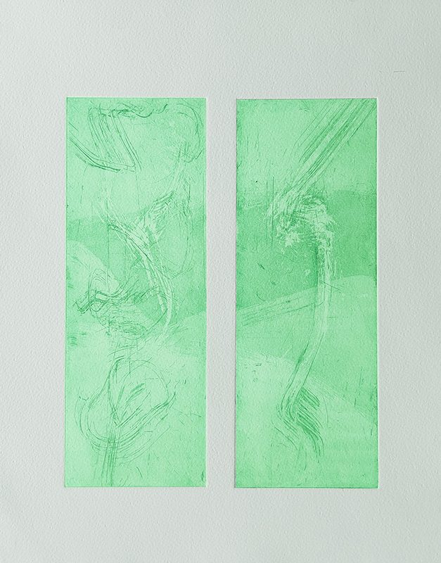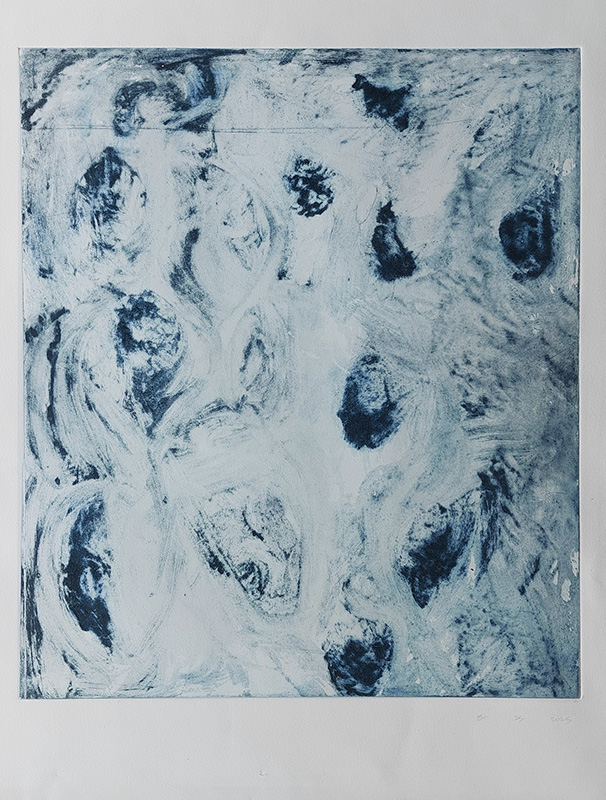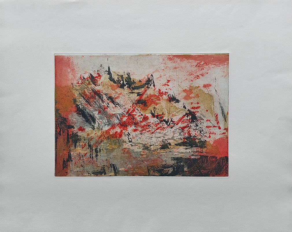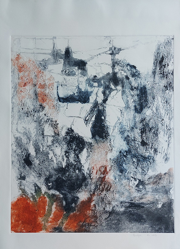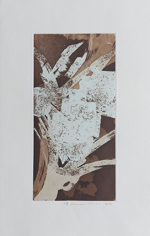 Les gravures au carborundum sur plexiglas permettent des formats plus grands et un travail de composition et de gestuelle proches de celui de la peinture.
