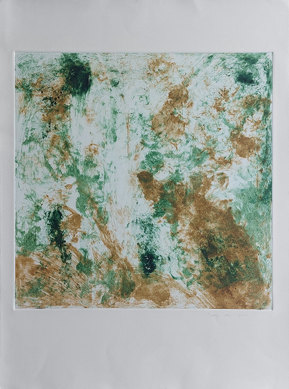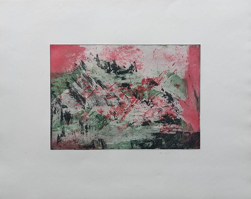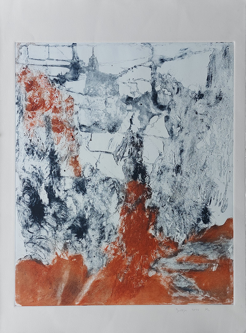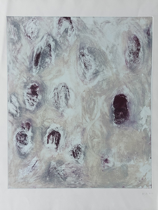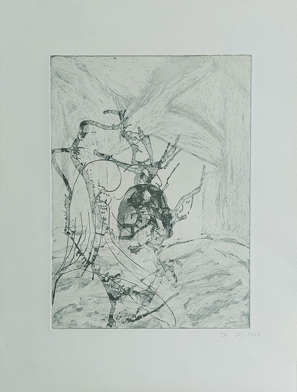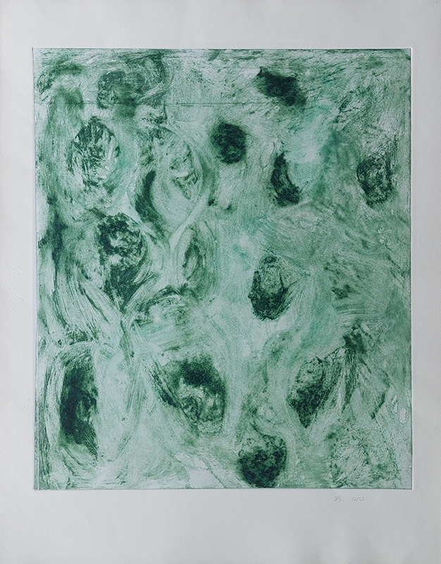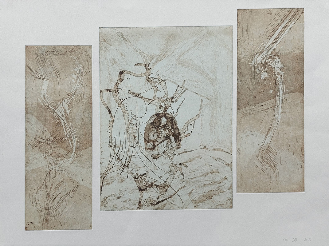 Les gravures au carborundum sur plexiglas permettent des formats plus grands et un travail de composition et de gestuelle proches de celui de la peinture.